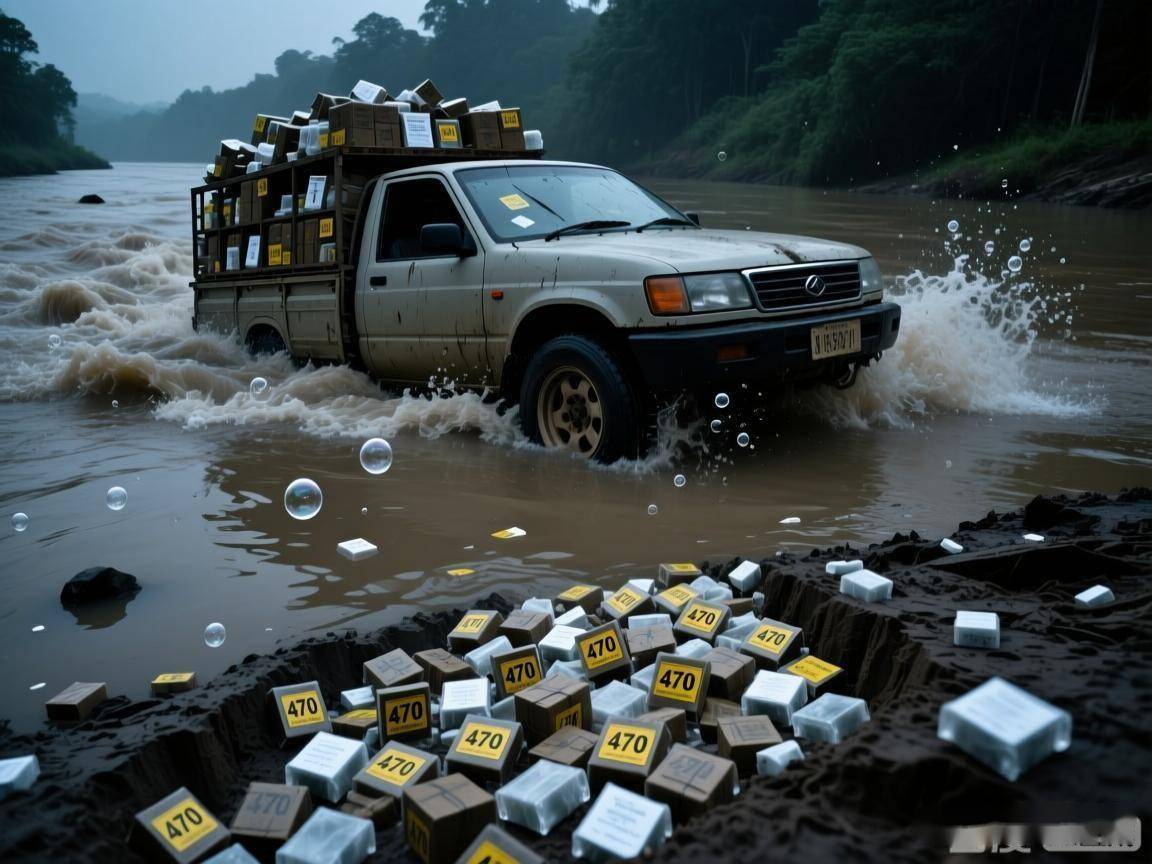 随着一声巨响,卡车重重坠入运河,车身侧翻,车厢里的东西瞬间散落出来——一开始飘在水面上的,是生姜、玉米之类的农产品,看起来和普通运粮车没什么区别;但紧接着,一个个黑色的袋也跟着浮了起来,袋子被水浸泡后破裂,无数白色、黄色的小药丸,像雨点一样散落出来,漂满了水面。
